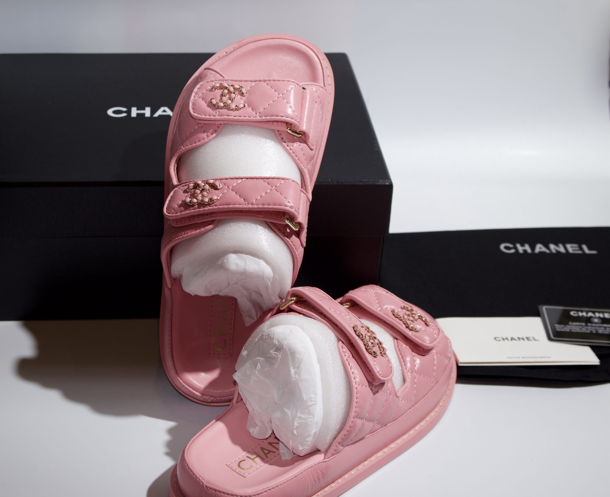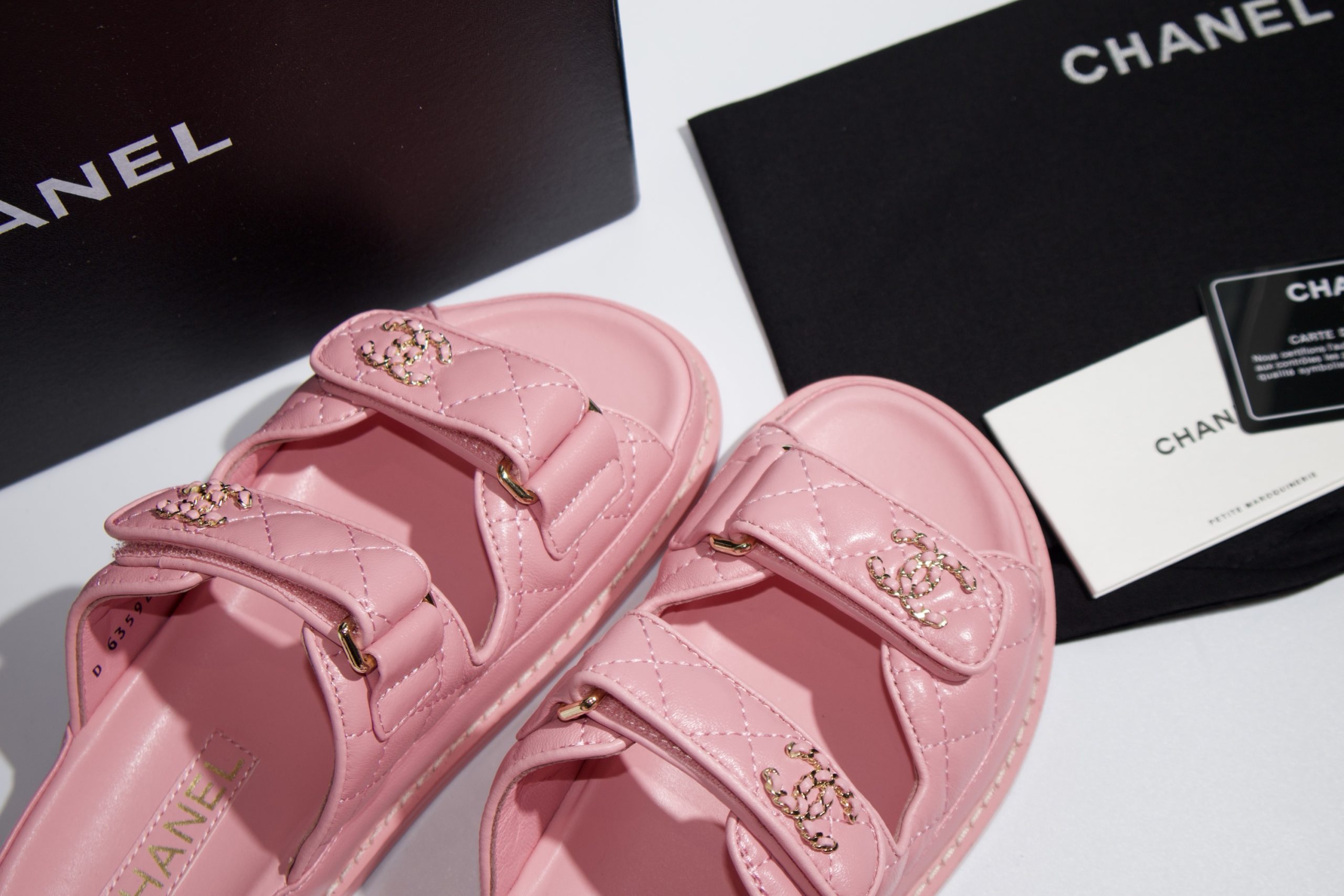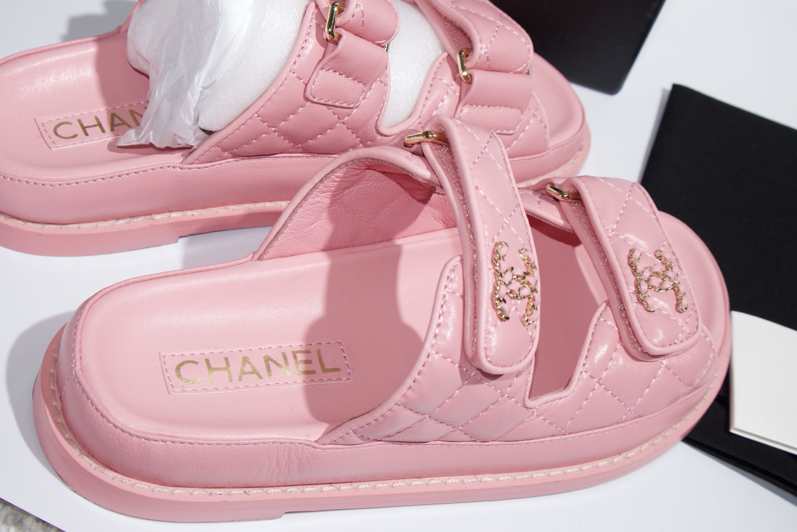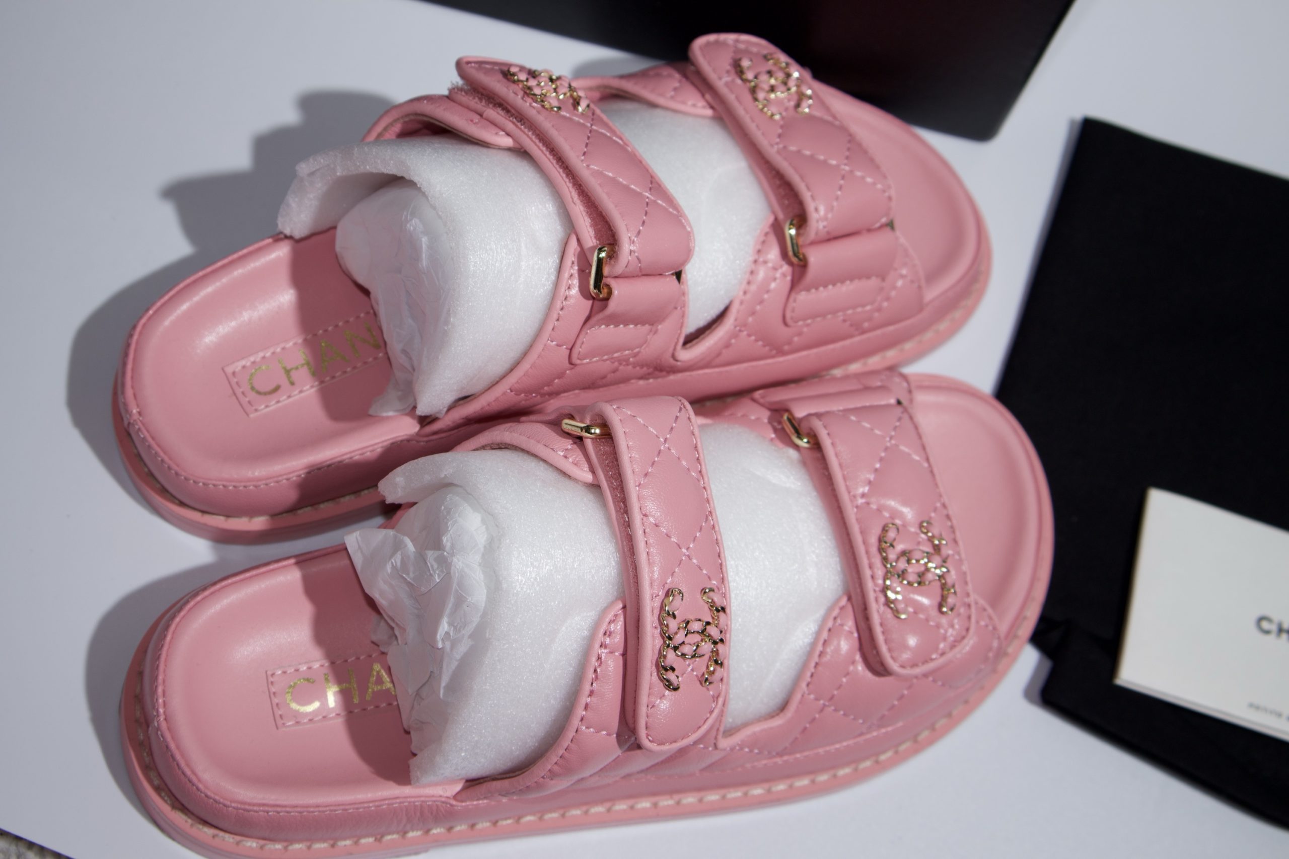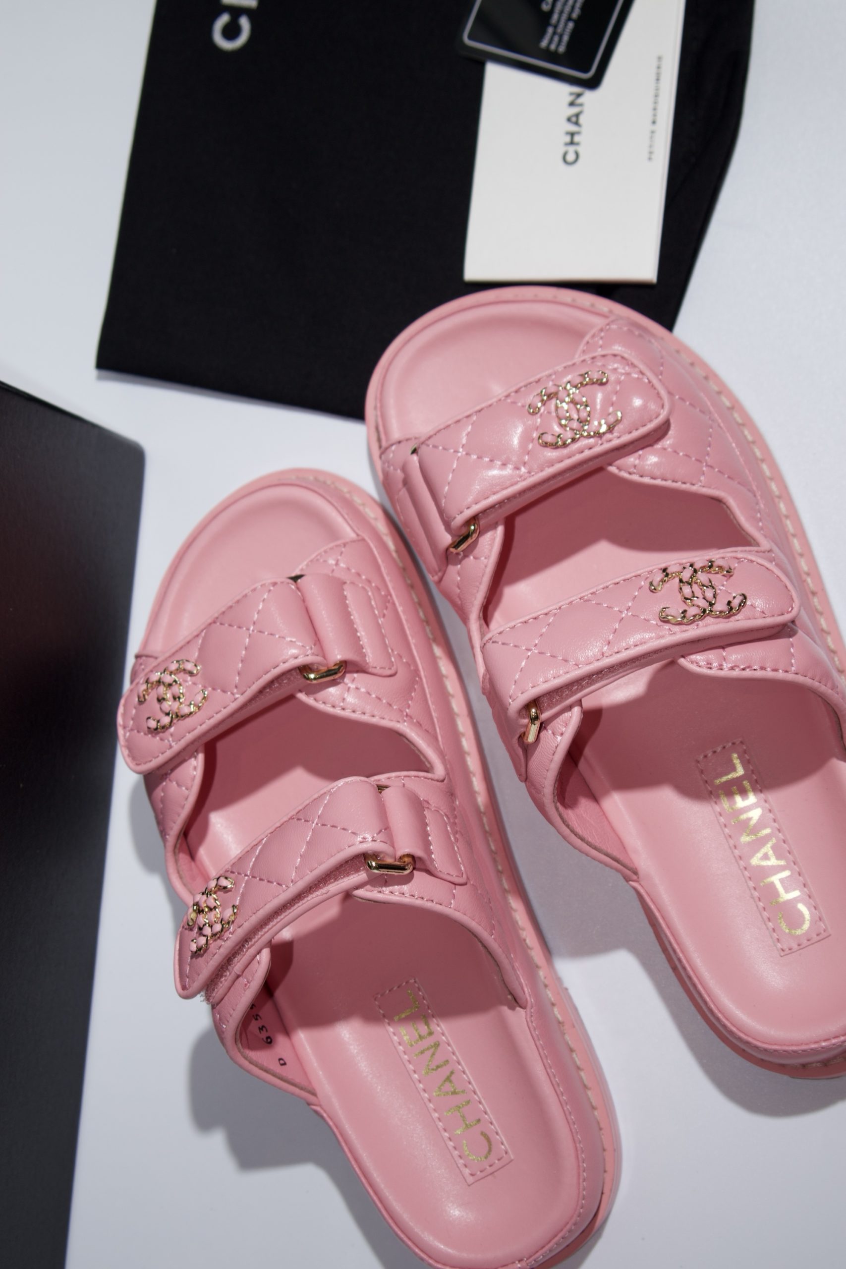 Pink diamond-quilted-leather Dad Sandals. Double C jewel on the velcro straps. Gold-tone brass jewelry.