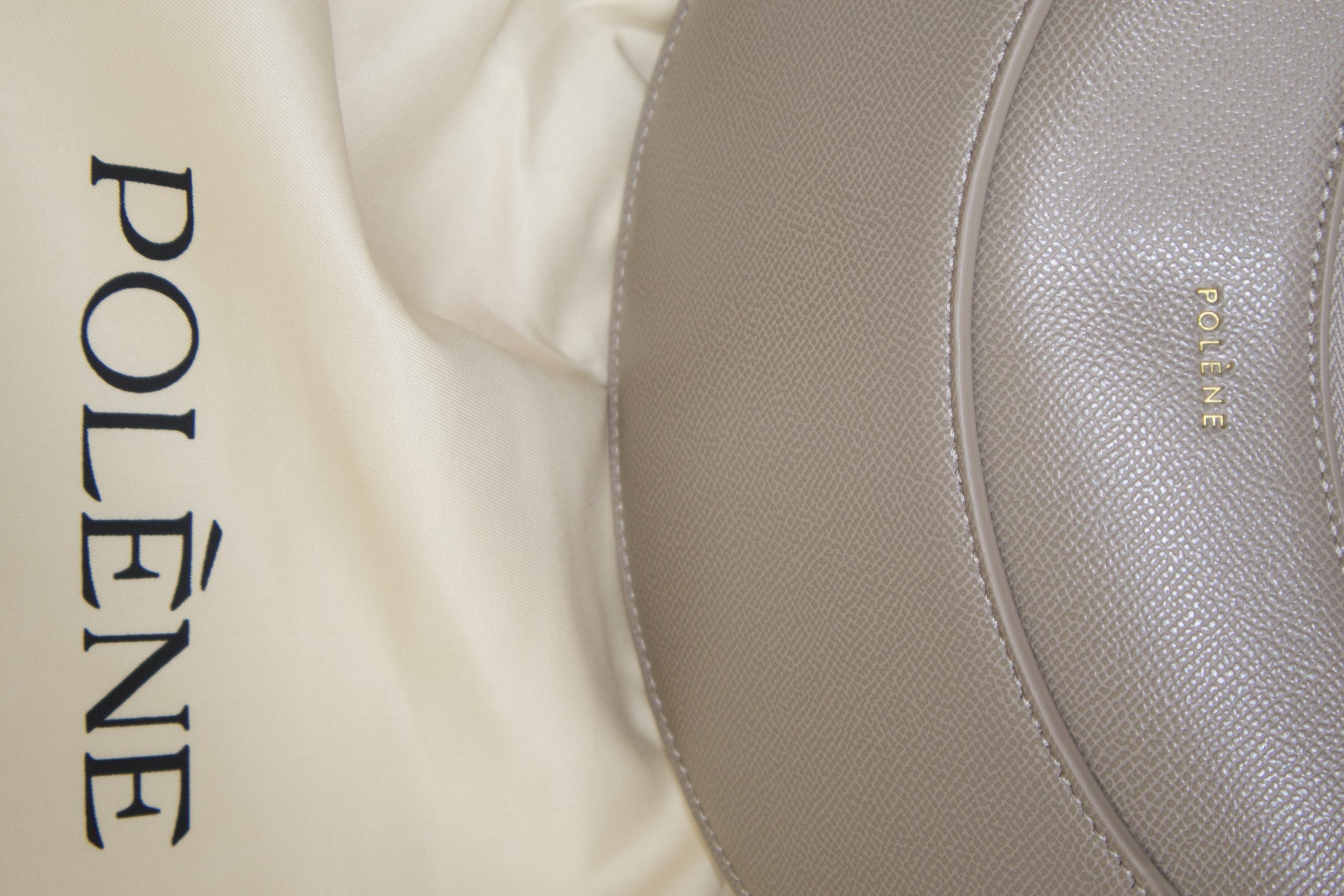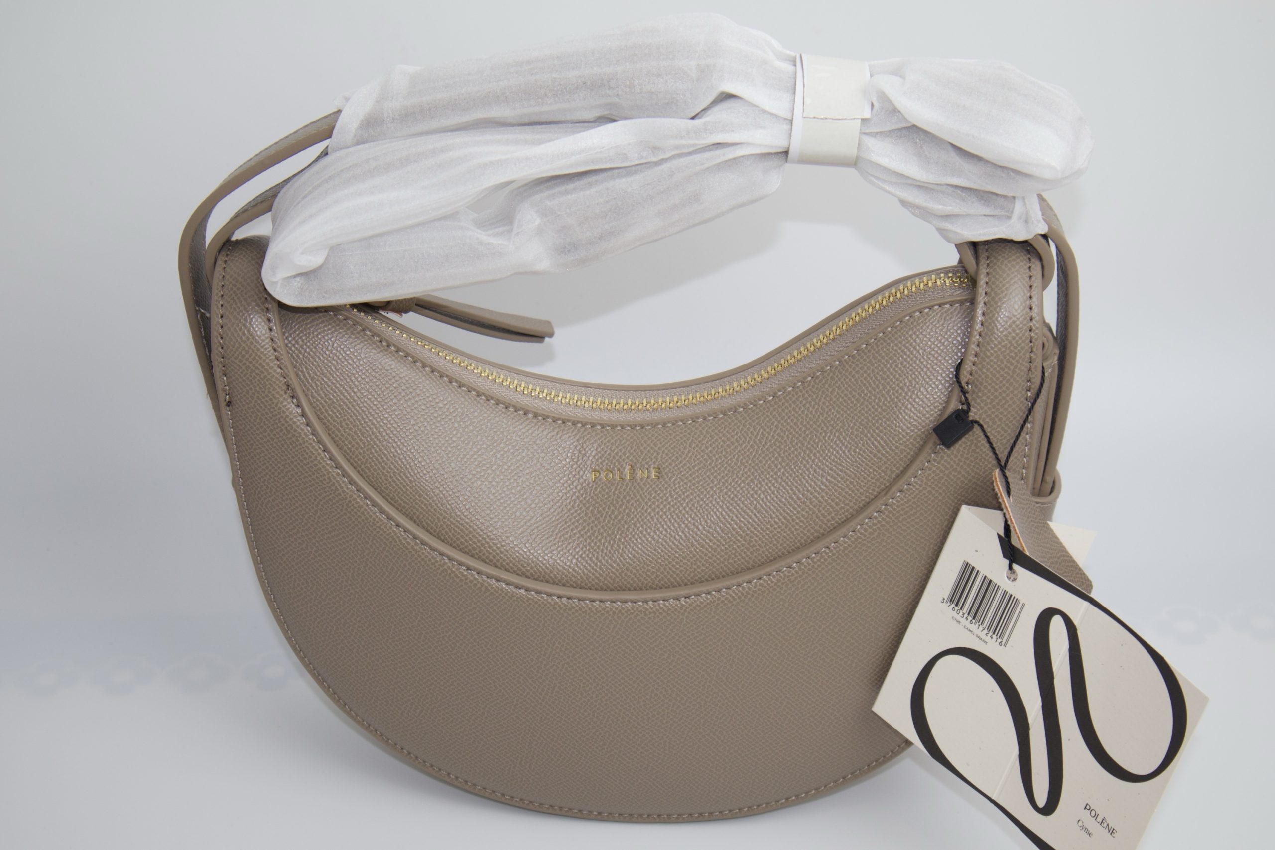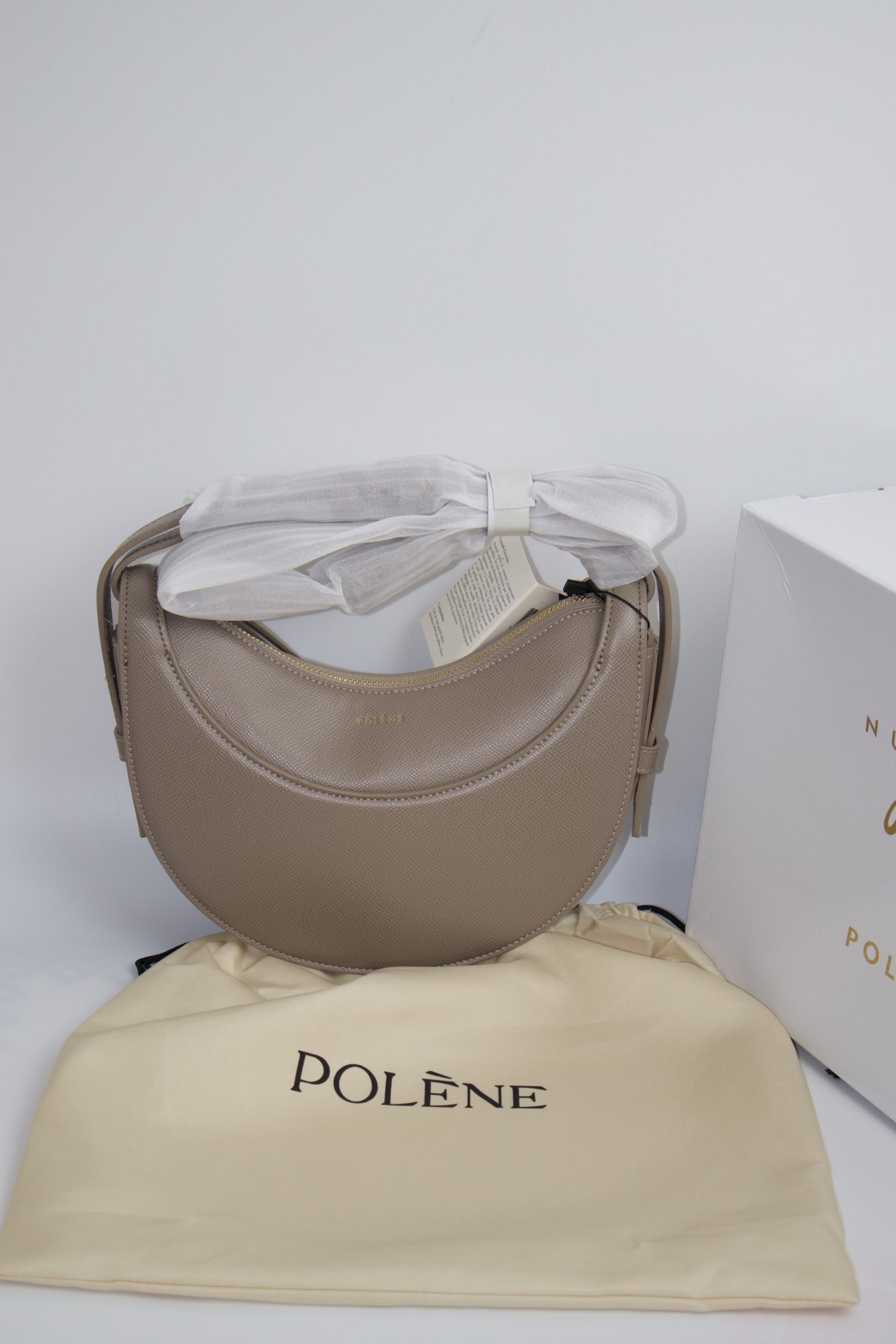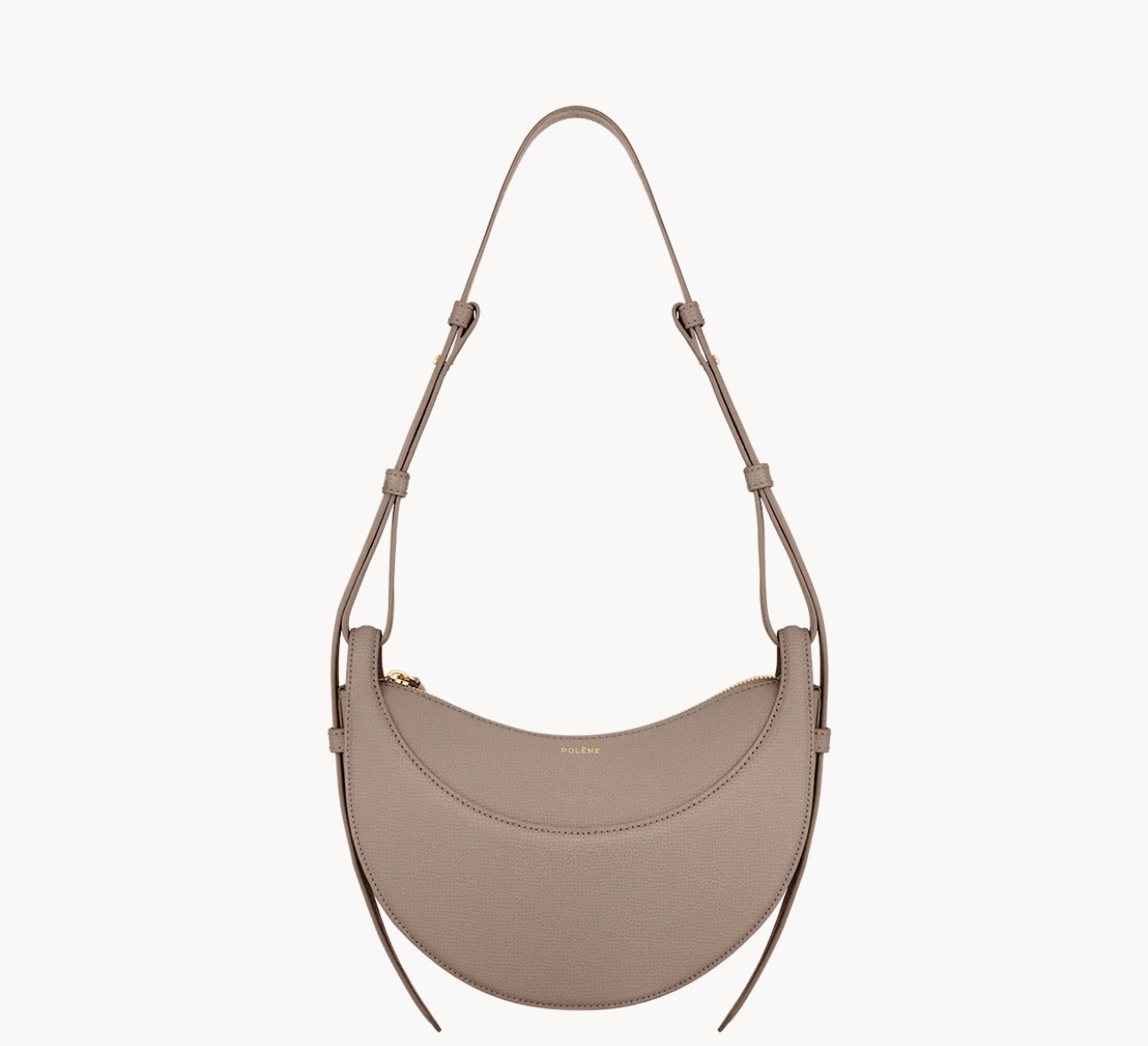 bag in the textured taupe color. It is a half-moon shaped bag that can be carried as a handbag, shoulder bag, or crossbody bag.