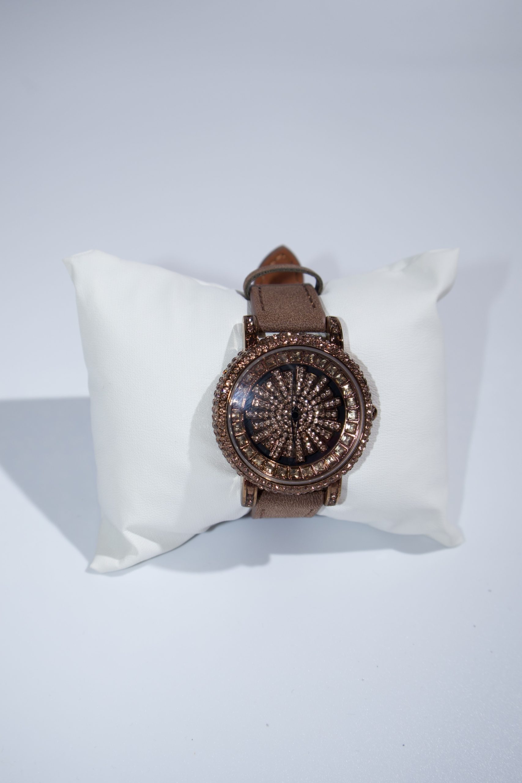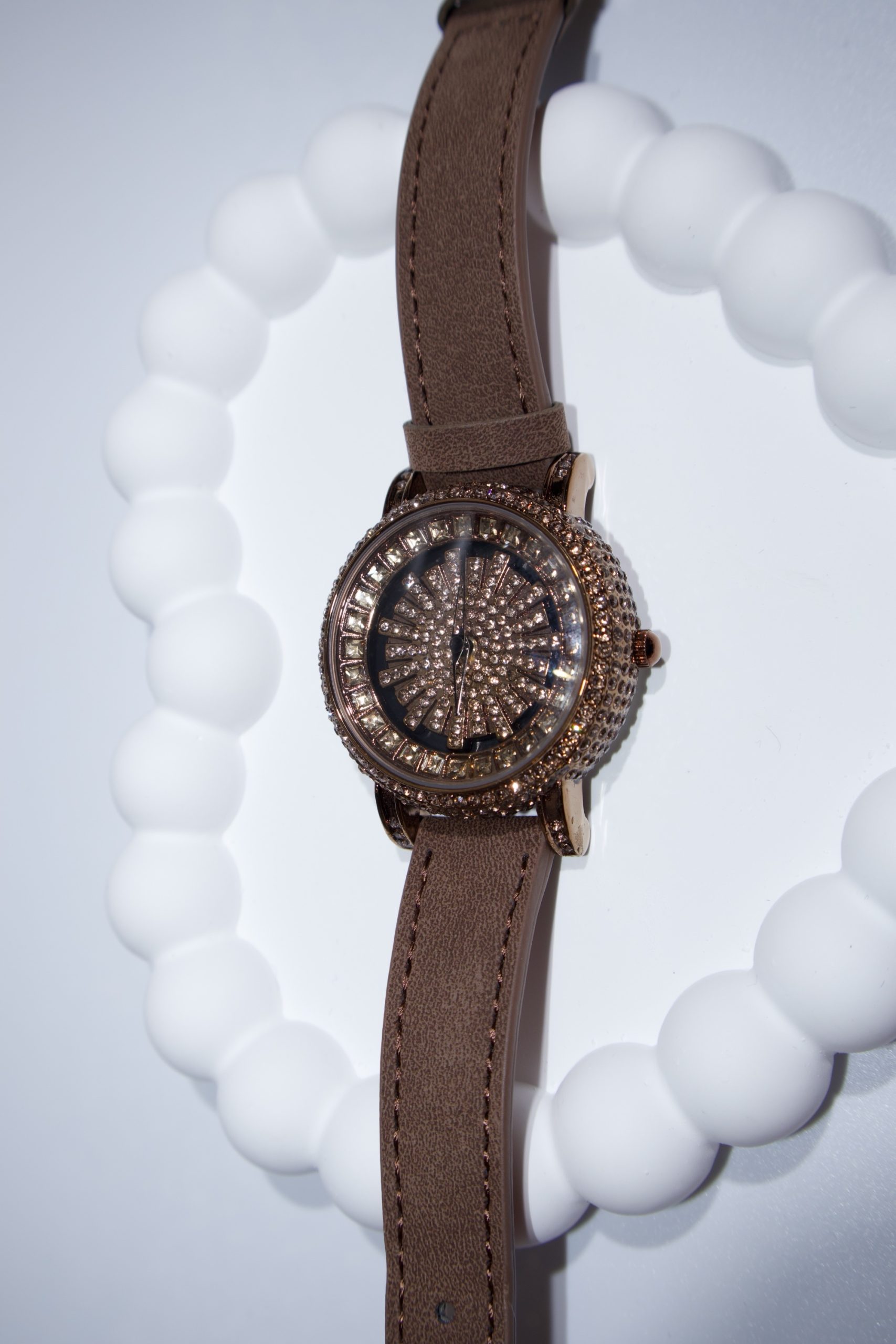 This item is a women’s light luxury quartz fashion watch featuring a diamond-set detailing and a genuine leather strap